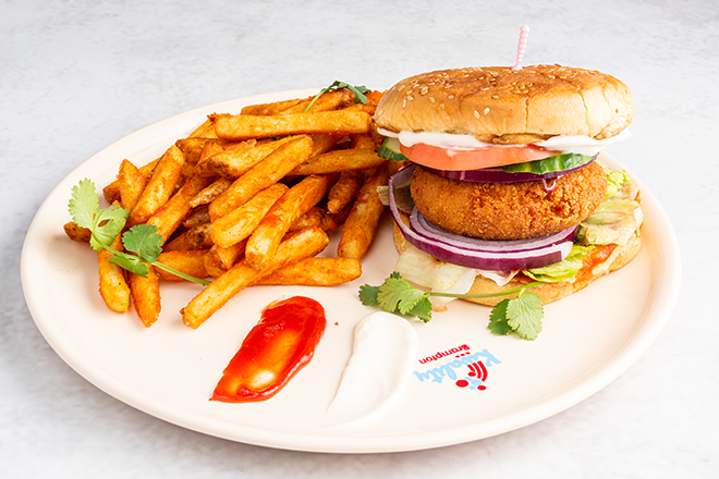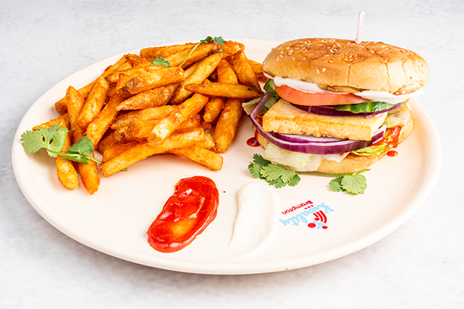Featuring two perfectly fried paneer patties infused with rich Indian spices, it’s layered with crisp lettuce, juicy tomato, fresh onion & cool cucumber slices. Finished with a creamy mayo & spicy sriracha blend, all in soft, grilled burger bun. Served with a side of French Fries.