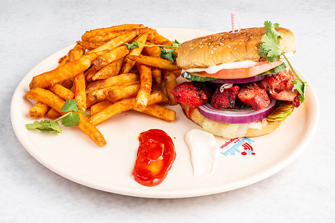 Tender, juicy & perfectly seasoned 100% Canadian-raised chicken infused with bold tandoori spices. Layered with crisp lettuce, juicy tomato, fresh onion & cool cucumber slices, it's topped with a creamy mayo & spicy sriracha blend. All in a soft, grilled bun. Served with a side of French Fries.