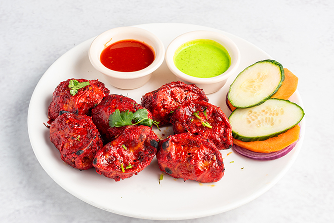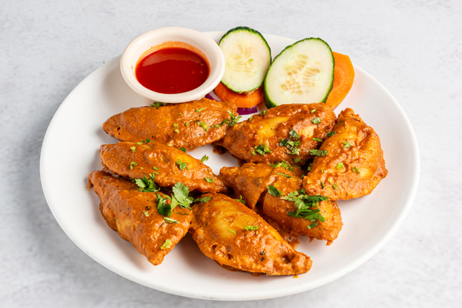 7pcs Delicate dumplings filled with a flavorful blend of minced chicken or cottage cheese, aromatic herbs & spices. Lightly pan-fried for a golden crust, then finished in a Tandoor for a smoky, charred perfection. Paired with a zesty dipping sauce.