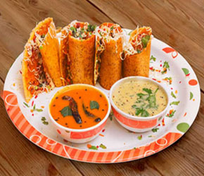 Dosa rolled with cabbage, potatoes, carrots with Indian spices & sprinkled with cheese and has nuts.