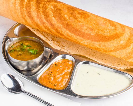 Extra Large Dosa Dosa spread with a blended mix of tomato, garlic, carrots, cabbage, green peas, potatoes, chillis & Indian spices. Topped with chopped mixed vegetables & sprinkled with cheese and no nuts.