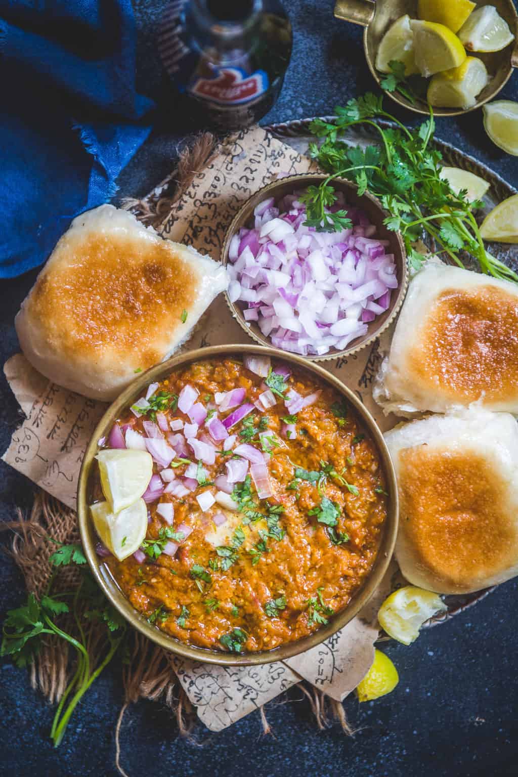 Pav bhaji is a street food dish from India consisting of a rich vegetable curry (bhaji) served with soft bread rolls (pav).