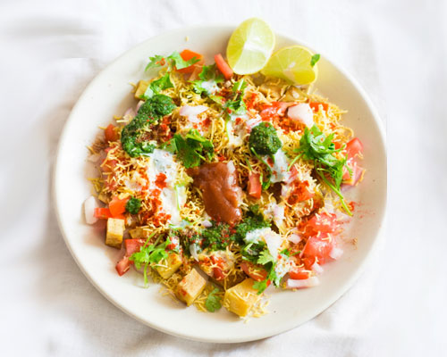 Crunchy wafers topped with chick peas, potatoes, yogurt, tamarind & spicy sauce.