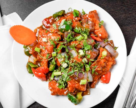 Handmade, crispy pastry stuffed with a savory filling of spicy potatoes & peas. Served with Channa Masala, sweet & spicy sauce.