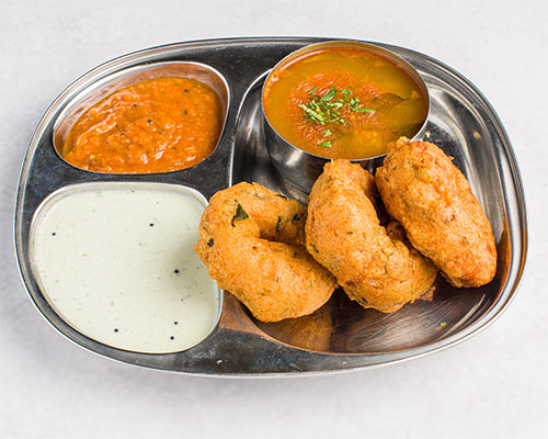 Sambar Vada is a fried, doughnut shaped south Indian delicacy made from lentils. Served with sambar coconut & tomato chutney