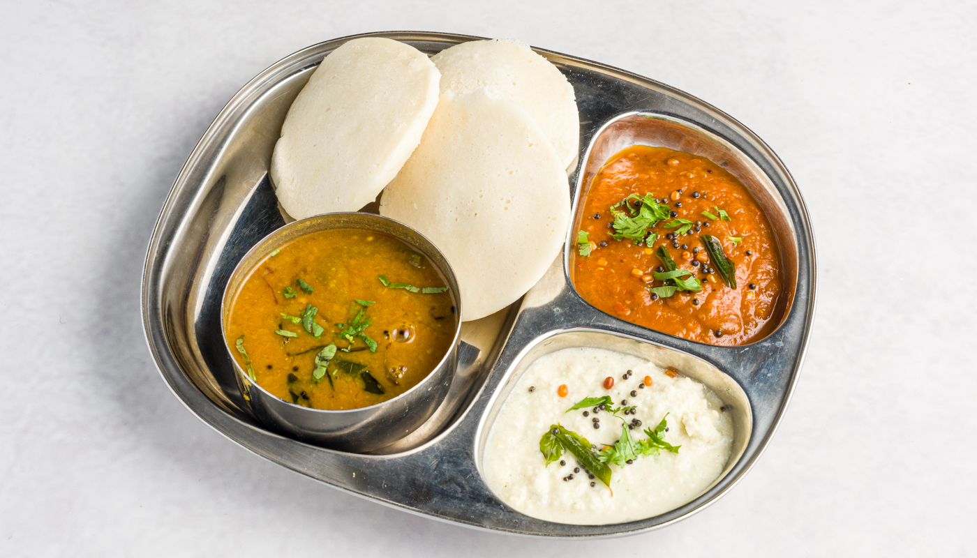 Sambar Idly/Vada combo. Served with sambar coconut & tomato chutney